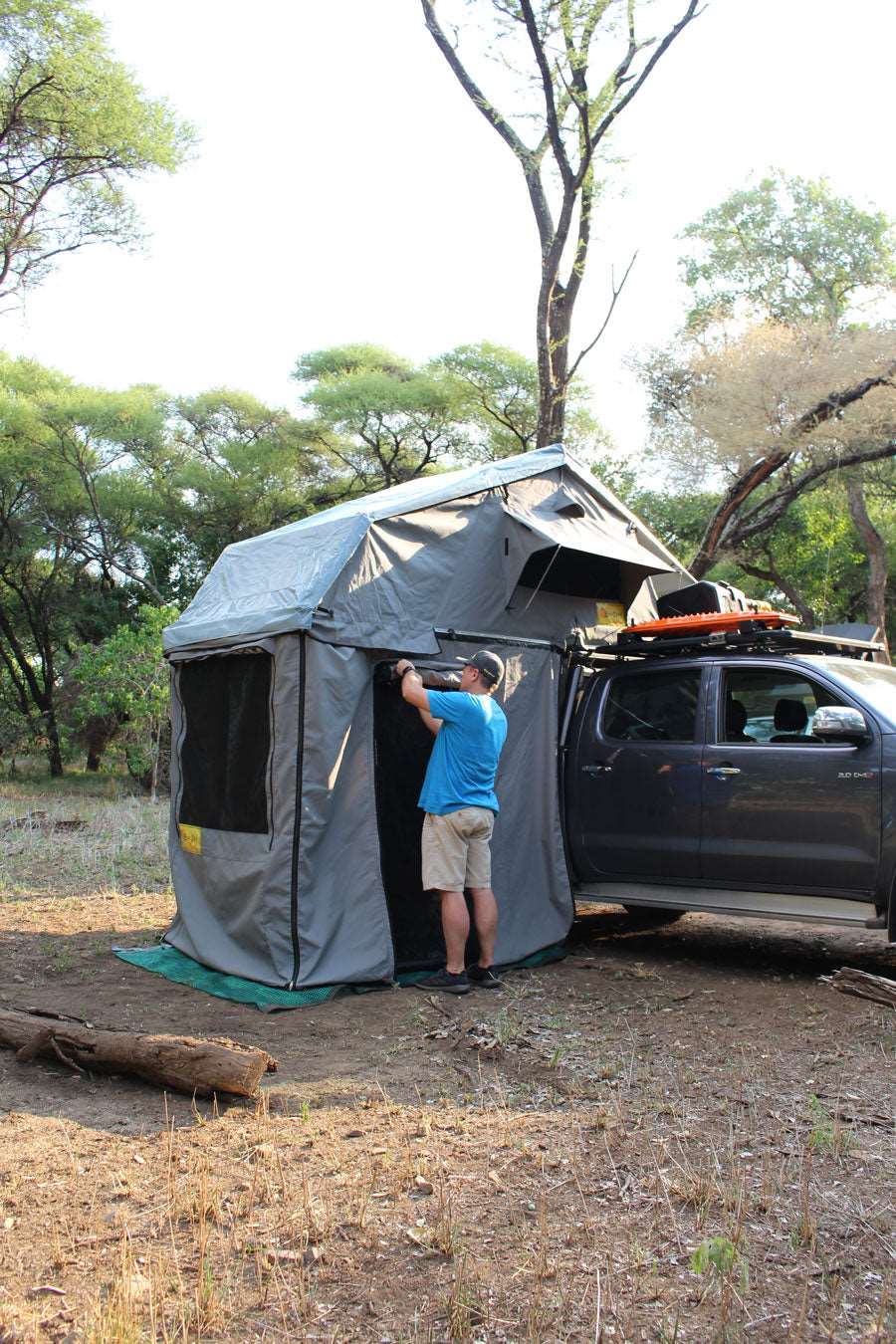 The Xklusiv tents come standard with an add-a-room that slides and hooks into place.