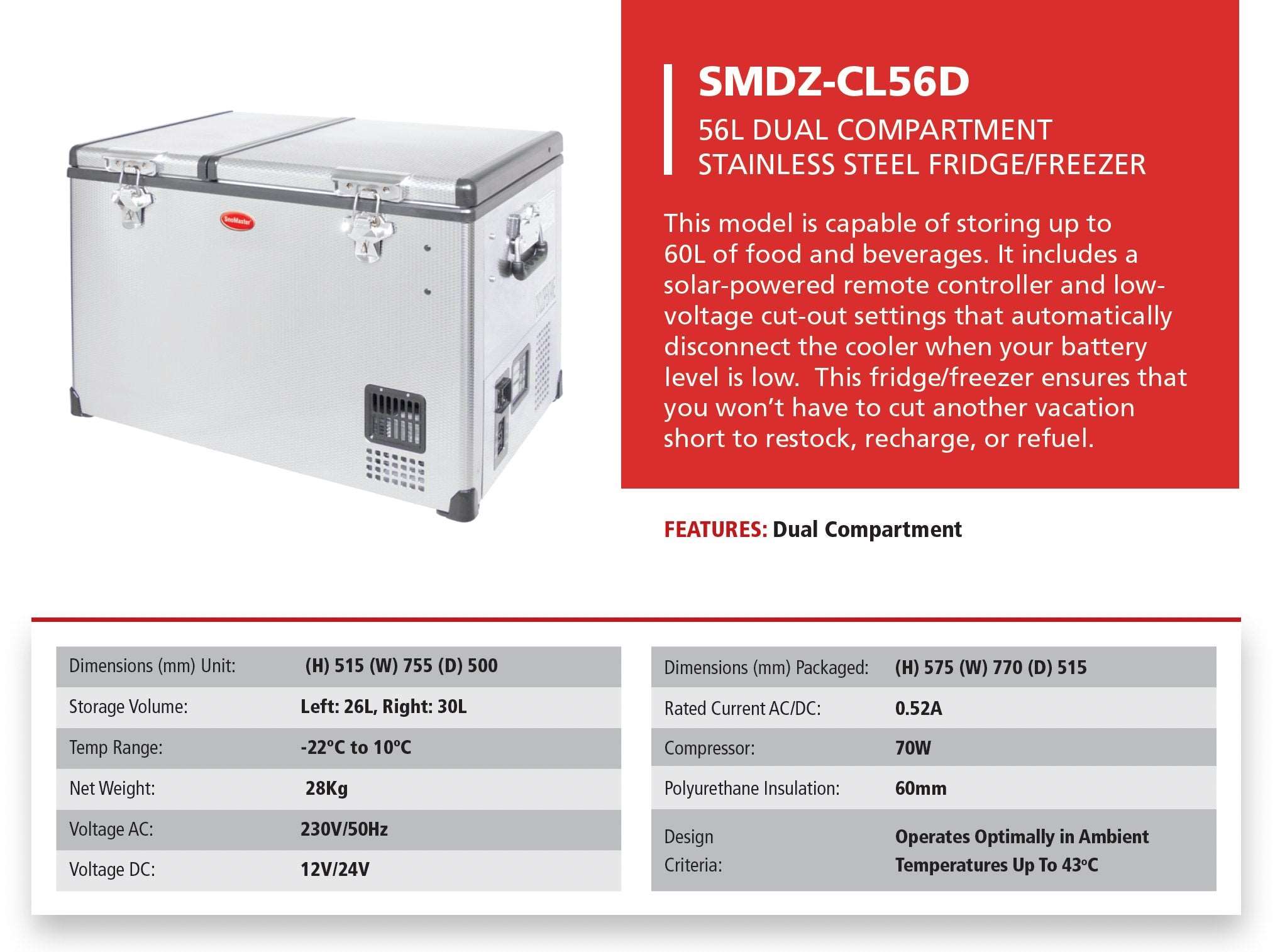 56L Dual Compartment Stainless Steel Fridge/Freezer AC/DC by Snomaster